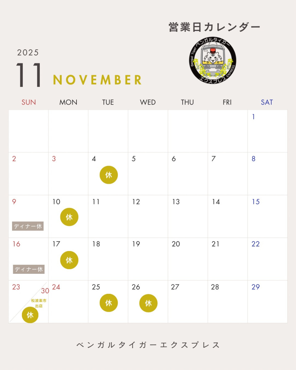ベンガルタイガーエクスプレス(千葉駅西口ウエストリオ2) 11月の営業予定を更新しました